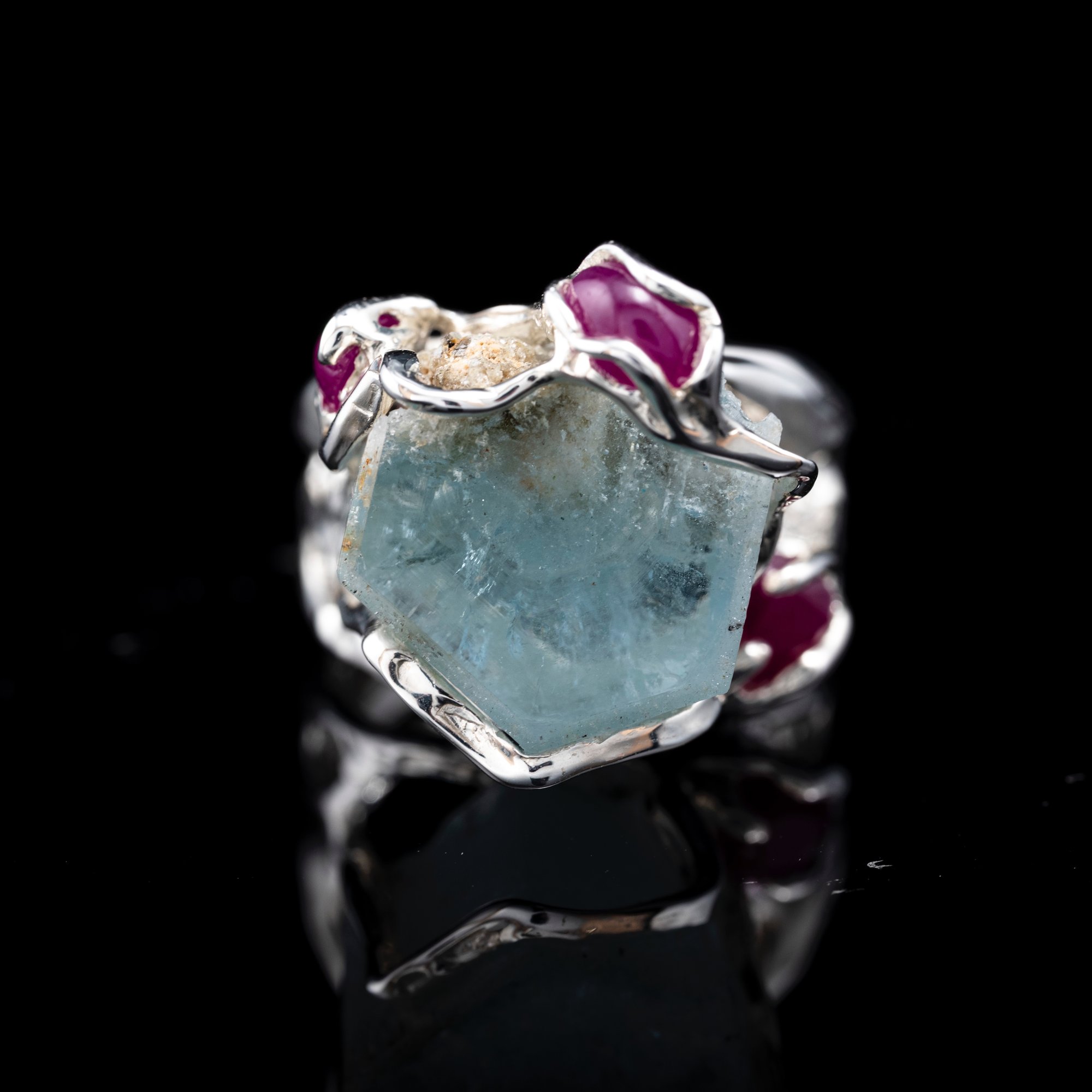 Каблучка з аквамарином та рубінами