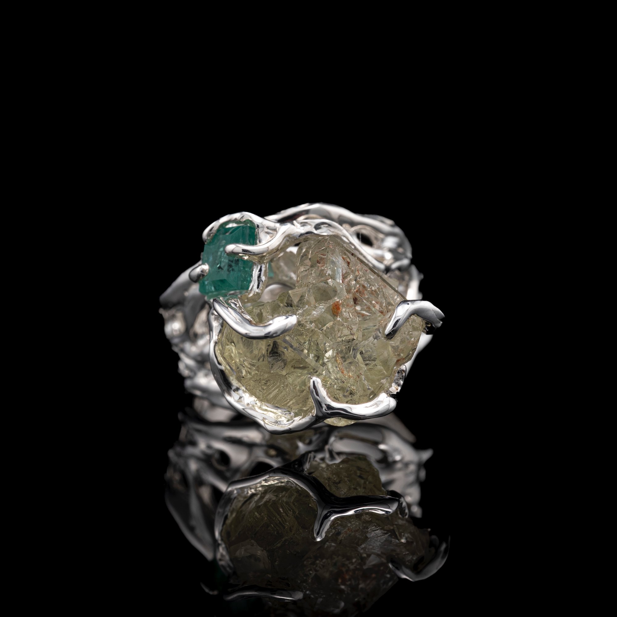 Каблучка з геліодором та смарагдом