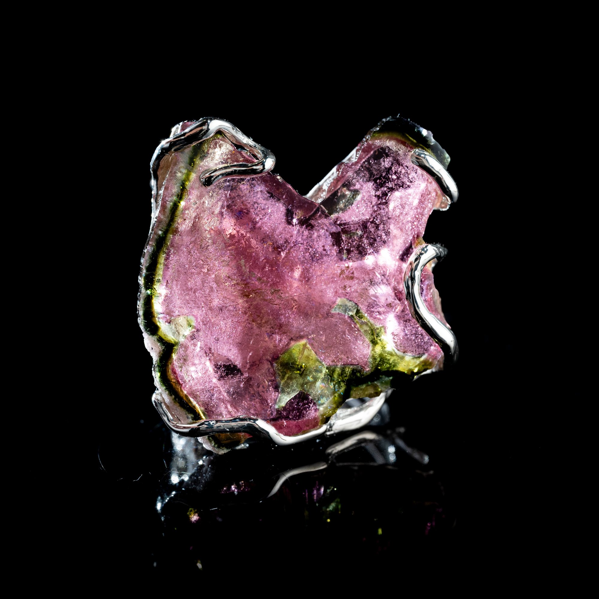 Кавуновий турмалін – це захоплюючий і винятково красивий різновид мінералу турмаліну (найчастіше ельбаїту), відомий своїм унікальним двоколірним (біколорним) забарвленням, що візуально нагадує соковитий зріз кавуна. Зазвичай він має яскраво-рожевий або червоний центр (ядро кристалу), оточений контрастною зеленою зовнішньою зоною ('кіркою'). Іноді ці зони можуть бути розділені тонким білим або безбарвним прошарком. Таке характерне зонування кольору виникає через зміну концентрації хімічних елементів під час росту кристалу в природних умовах.